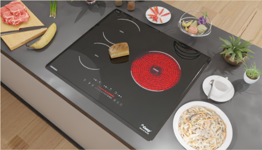 Bếp ba lò : 2 vùng từ 01 vùng hồng ngoại, sử dụng mặt kính Vitro Ceramic vát 4 cạnh bo góc sang trọng