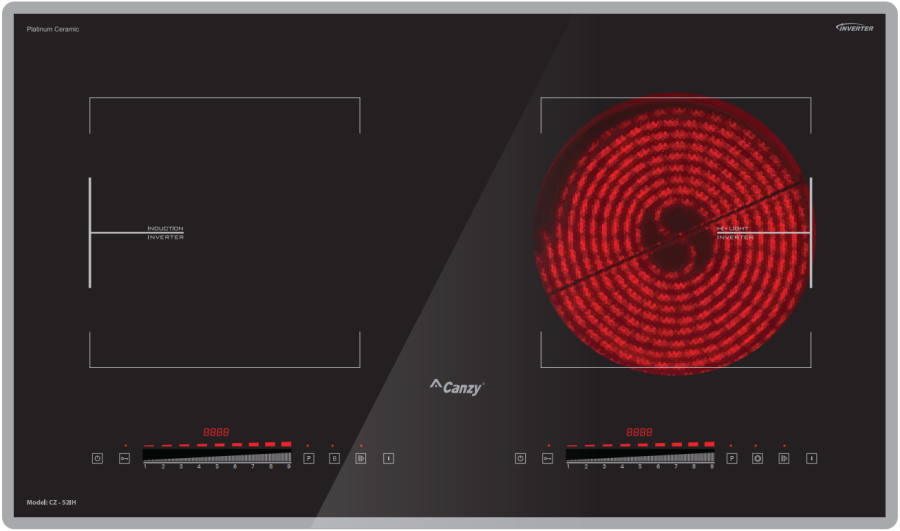 Bếp đôi: 01 từ 01 hồng ngoại, sử dụng mặt kính Platinum Ceramic vát 4 cạnh bo 4 góc sang trọng Sử dụng bản mạch mâm từ sản xuất theo công nghệ Châu âu