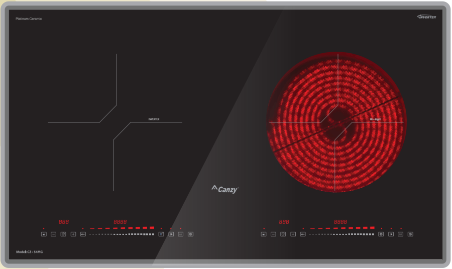 Bếp đôi: 1 vùng từ + 1 vùng hồng ngoại sử dụng mặt kính Platinum Ceramic vát 4 cạnh bo viền nhôm sáng bóng, bo 4 góc sang trọng