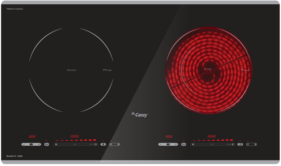 Bếp đôi: 1 vùng từ + 1 vùng hồng ngoại sử dụng mặt kính Platinum Ceramic vát 2 cạnh dài, bo 4 góc sang trọng
