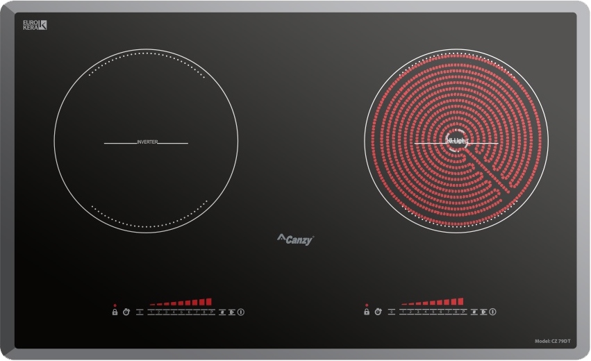 Bếp điện từ CANZY CZ 79DT là sản phẩm bếp 02 lò tư kết hợp hồng ngoại thuộc phân trung cấp nhưng sử dụng linh kiện cao cấp. Bếp sử dụng mặt kiếng Eurokera của Pháp là sản phẩm mặt kiếng dành cho bếp từ thuộc Top 1 trên thế giới hiện nay ngang hàng với Schott Ceran của Đức.