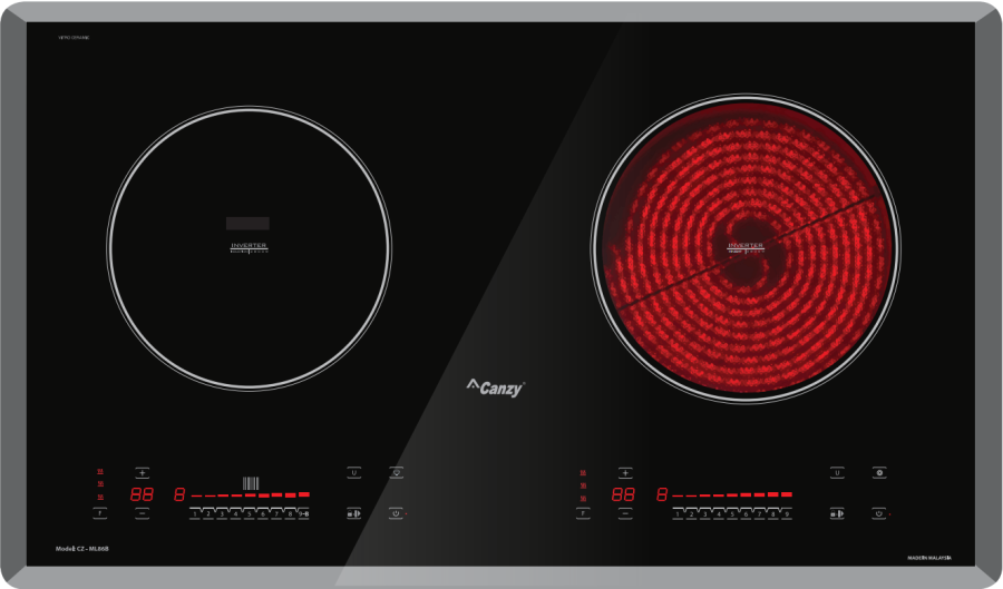 Bếp đôi: 01 từ 01 hồng ngoại sử dụng mặt kính Vitro Ceramic vát 4 cạnh bo góc sang trọng