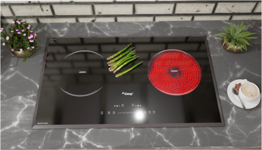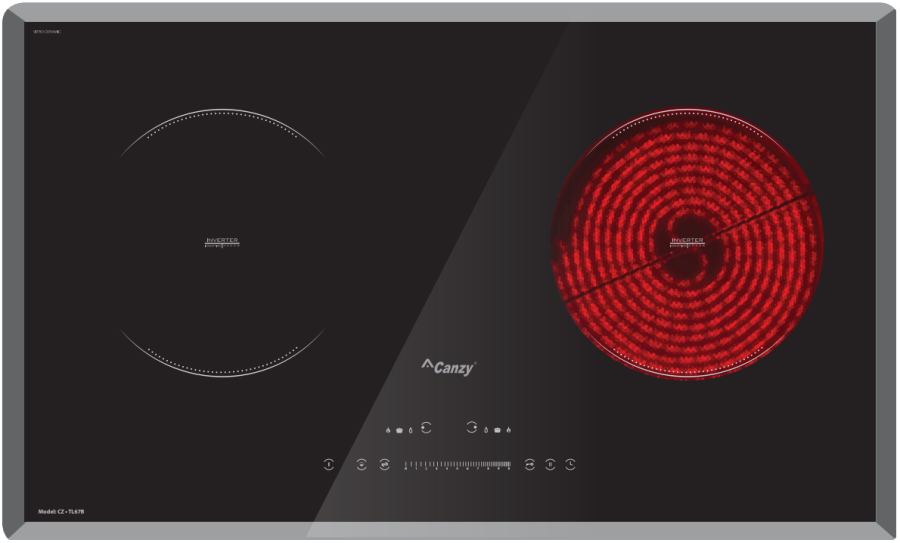 Bếp đôi: 01 từ 01 hồng ngoại sử dụng mặt kính Vitro Ceramic vát 4 cạnh bo góc sang trọng
