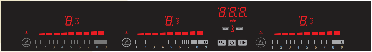 Chức năng nấu thông minh Heat up time Automatic (Nhấn giữ slider ở một mức bất kỳ bếp sẽ tự động Booster chế độ nấu nhanh một thời gian rồi trở về mức công suất đã giữ)