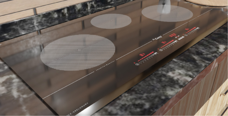 Bếp ba: 3 vùng từ, sử dụng mặt kính Schott Ceran vát 2 cạnh bo góc Sử dụng mâm từ E.G.O Germany tiêu chuẩn đạt chất lượng EMC, CE