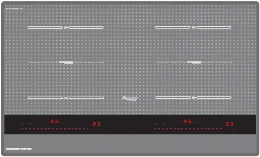 Bếp đôi: 2 vùng từ Mặt kính Kanger trong suốt in sần hiệu ứng vân xanh, vát 4 cạnh, bo góc