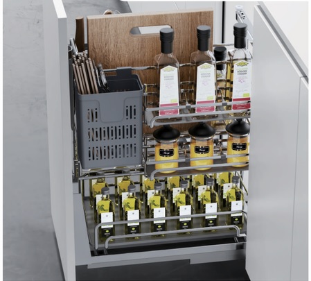 – Bộ ray có cấu tạo chắc chắn, chịu được trọng tải lớn lên tới 20kg giúp bạn thoải mái lưu trữ, bảo quản các chai lọ gia vị, dao thớt và đũa thìa tránh môi trường ẩm mốc và sinh vật gây hại.