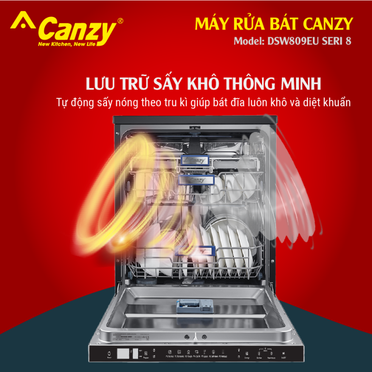 Làm nơi lưu trữ bát đĩa thông minh: Công nghệ sấy nóng làm khô nhanh chóng + với sấy khô thông minh theo chu kỳ, máy giúp lưu trữ bát đĩa luôn trong tình trạng khô và diệt khuẩn. Rửa xong bạn có thể để bát đĩa ngay trong máy mà không sợ nấm mốc.